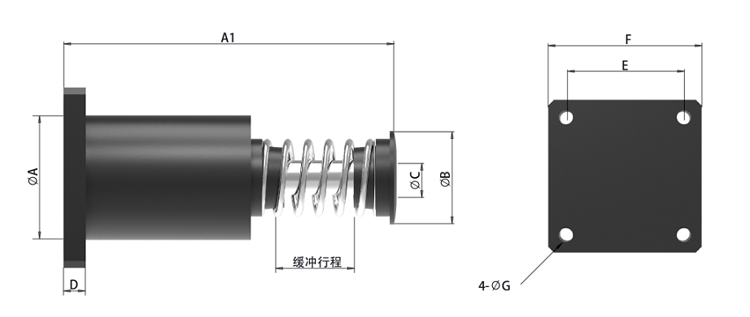 安裝要求:緩沖行程在300mm以內,較大允許側負荷角度為2.5°;緩沖行程為300mm以上,較大允許側負荷角度為1°;確保螺栓螺母鎖緊牢固,建議使用螺紋膠。